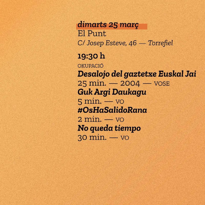 a les 18:30 els documentals “la doctrina de las pelotas asesinas” (4 min. – vo), “ojo con tu ojo” (15 min. – vo) i “we are now” (20 min – vo) tots dins de les categories de lluita social i tortura