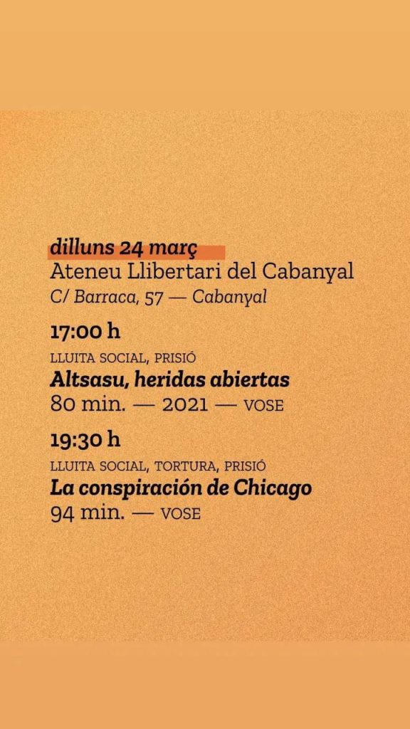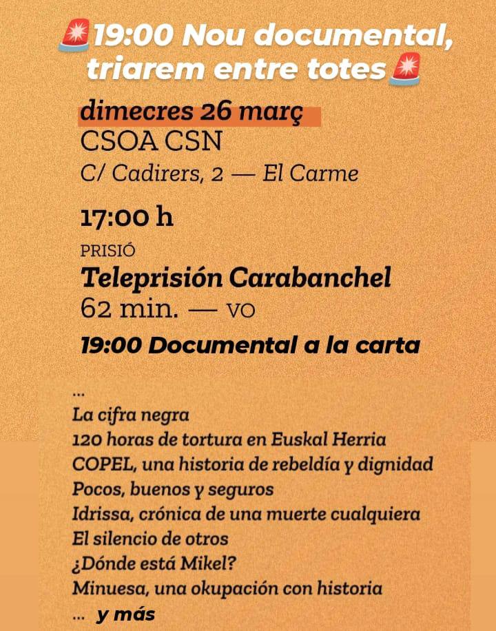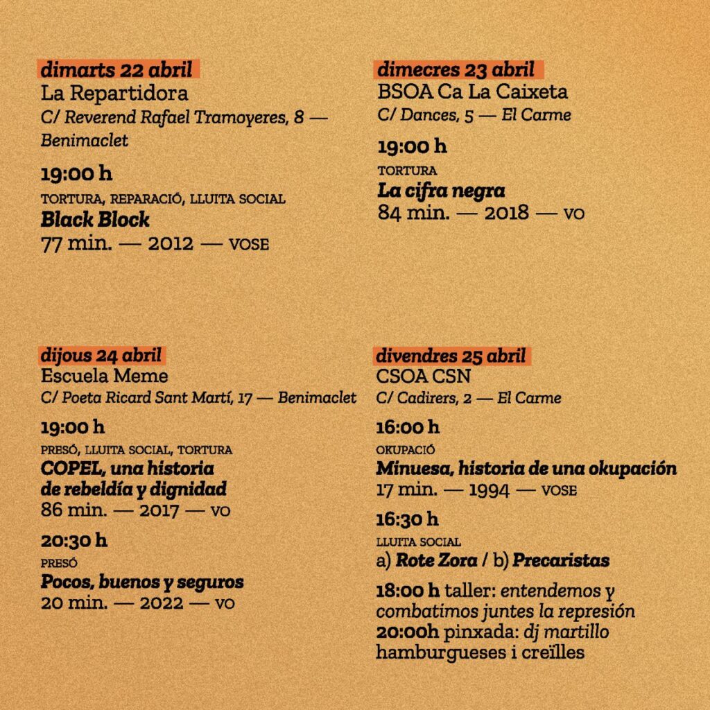 CSOA CSN C/Cadirers 2 – El Carme •16:00 Minuesa Historia de una okupación (17min) 1994 VOSE •16:30 a) Rote Zora – 70min. Lluita Social •18:00 Taller: Entenem i combatem junts la repressió •20:00 Pinxada: DJ Martillo