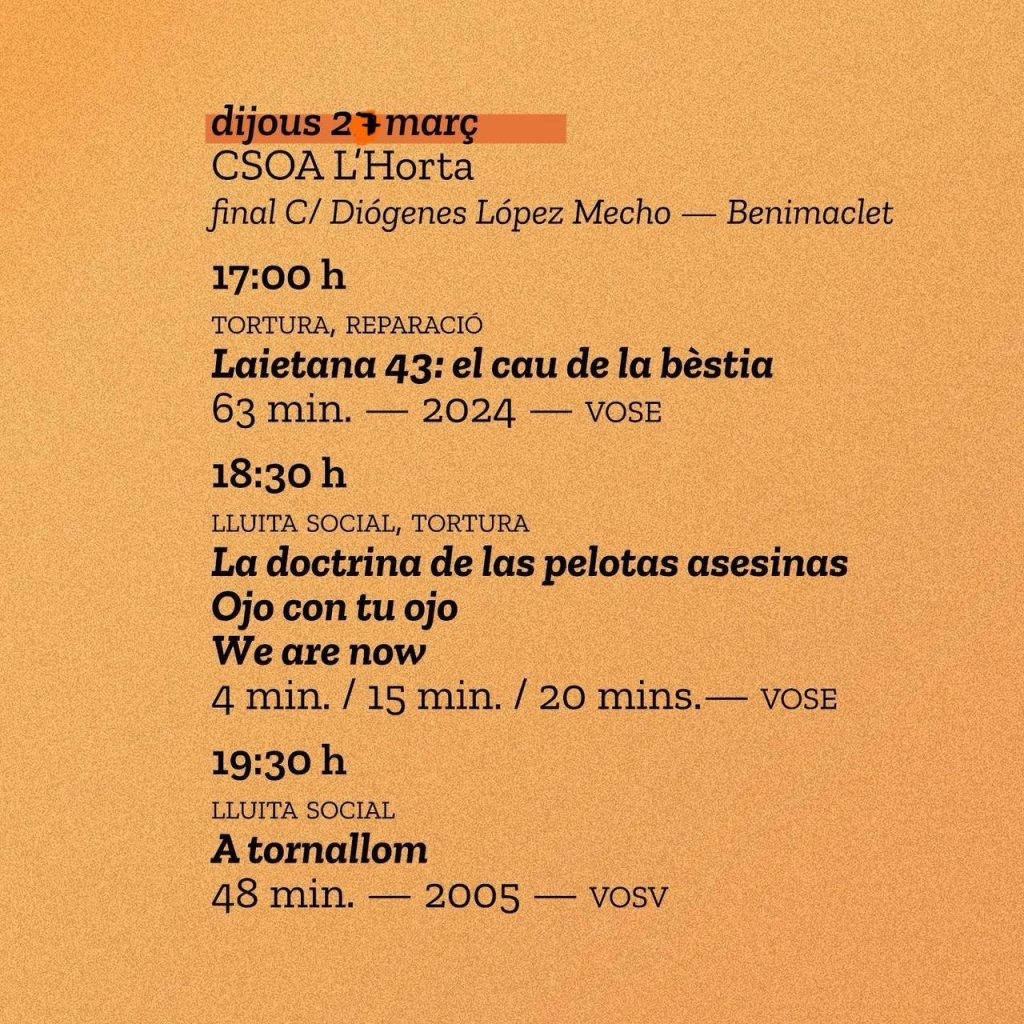 Escola Meme Benimaclet – C/Poeta Ricard Sant Martí,17 •19:00 – COPEL, una historia de rebeldía y dignidad – 86min -2017 – VO •20:30- Pocos, Buenos y Seguros – 20min – 2022 – VO (Presó, Lluita Social y Tortura)