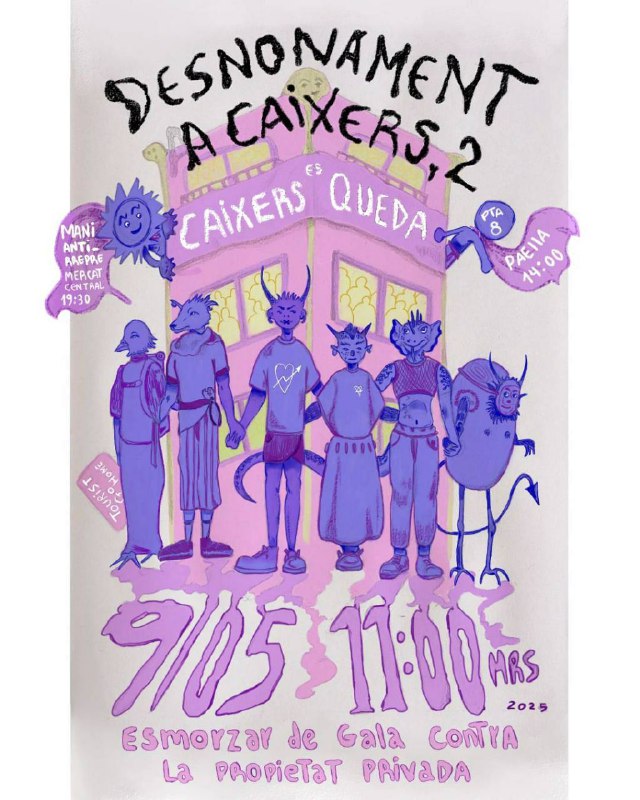 – 11h DESNONAMENT A CAIXERS, 2 (hi haurà esmorzar de gala contra la propietat privada, vine amb les teues millors robes! i dinarem juntis paella) –18h BENVINGUDA –19.30h MANIFESTACIÓ (plaça Mercat) –22h SOPAR
