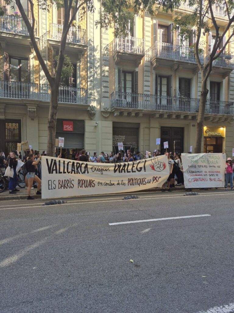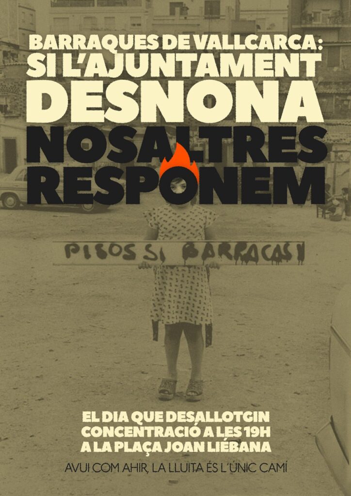 Més enllà del desallotjament de les famílies de les barraques de Vallcarca, veiem aquí una clara estratègia de repressió contra totes les formes d’autoorganització veïnal que s’oposen a aquest model de ciutat. A Ciutat Vella en tenim molts exemples: el desallotjament de la Massana, i de la Tancada, el rebuig al model autogestionat del Casal de Joves, la persecució que estant patint les treballadores sexuals autoorganitzades del carrer Robadors, la repressió que van patir els joves de l’Espai del Pi el dia del seu aniversari…