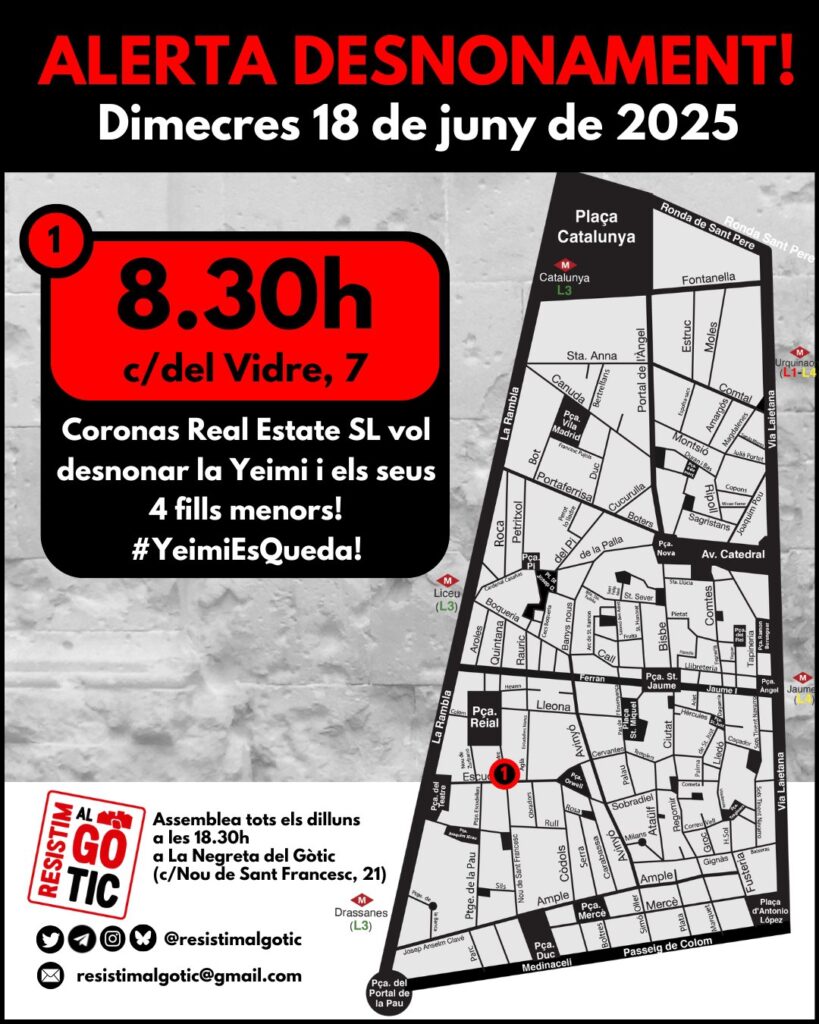 🔴Demà dimecres 18 de juny, Coronas Real Estate SL vol desnonar la Yeimi i els seus 4 fills/es menors.Coronas Real Estate SL forma part d’un entramat d’empreses a qui la Sareb va vendre milers de pisos a tot l’Estat. Yeimi i família compleixen TOTS els requisits per acollir-se a la moratòria de desnonaments però el jutjat, una vegada més, els nega els seus drets.No ho permetrem!