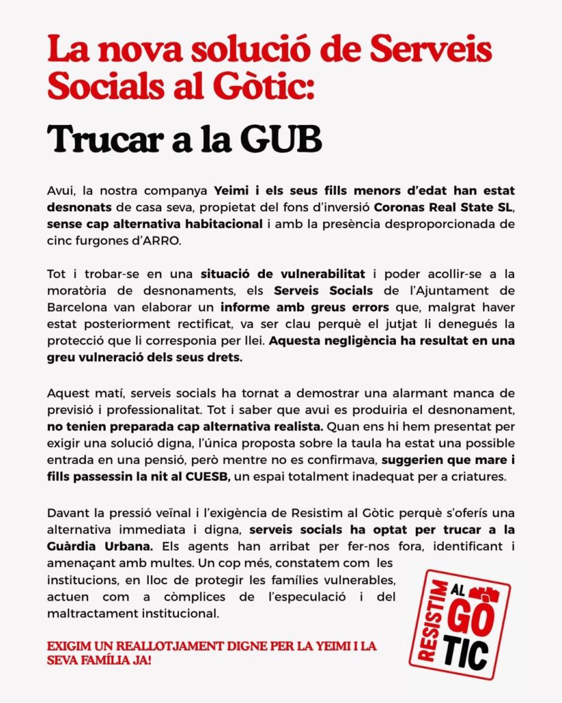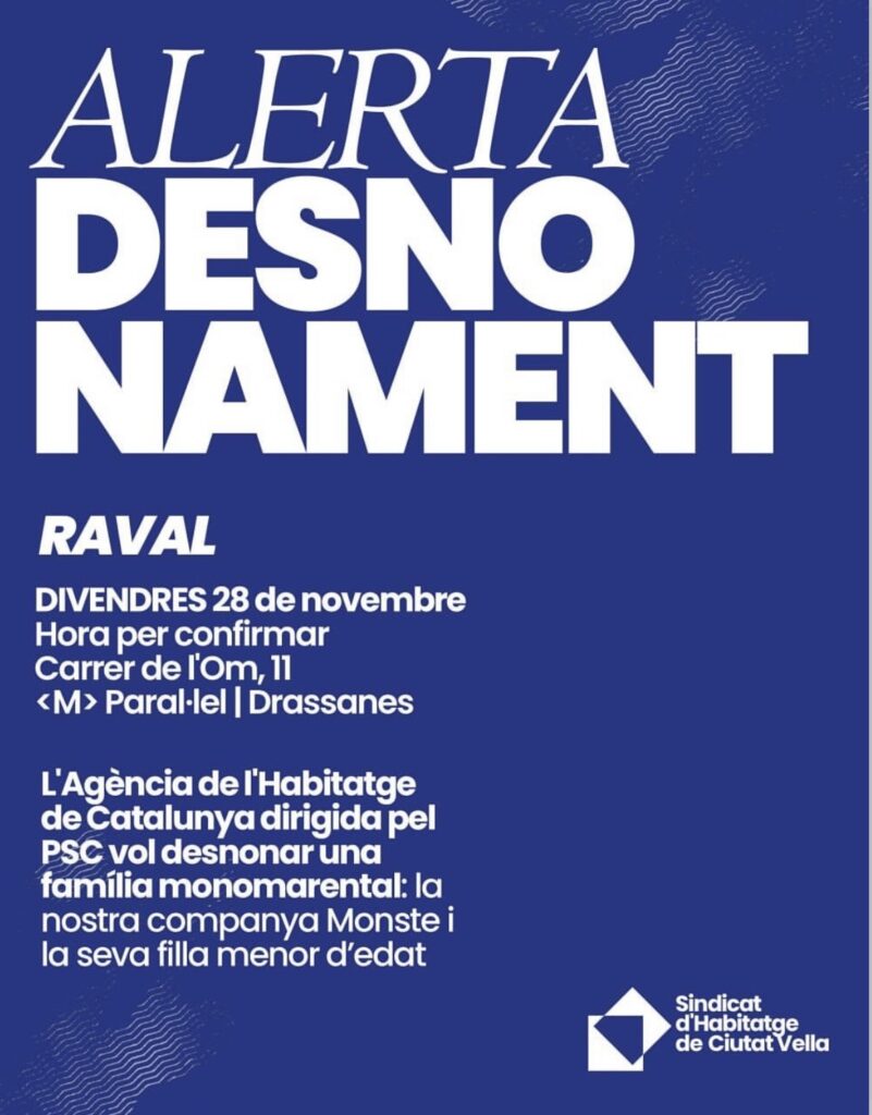 Otman y su familia (dos hijos y una hija, dos de ellos menores de edad), fueron desahuciados ayer a las 11 de la mañana sin haber recibido ninguna notificación del juzgado ni ningún aviso de su abogado, dejándolos en una situación de absoluta indefensión y vulneración de derechos. No pudieron presentar los recursos correspondientes ni los informes de vulnerabilidad, Servicios Sociales no fueron avisados, y el servicio de mediación municipal (SIPHO) se desentendió con el pretexto de que lo que habitaban era un bajo sin cédula de habitabilidad. Ante esta situación, desde Raval Rebel nos movilizamos y ocupamos el vestíbulo de Serveis Socials para denunciar la situación, mientras Otman y su familia se reunían con representantes de Servicios Sociales de Raval Nord acompañados de un representante de Raval Rebel y una representante de la Asociación de Familias Monoparentales. Durante esta reunión se presionó para conseguir un compromiso por parte de la administración de encontrar con urgencia un alojamiento digno.