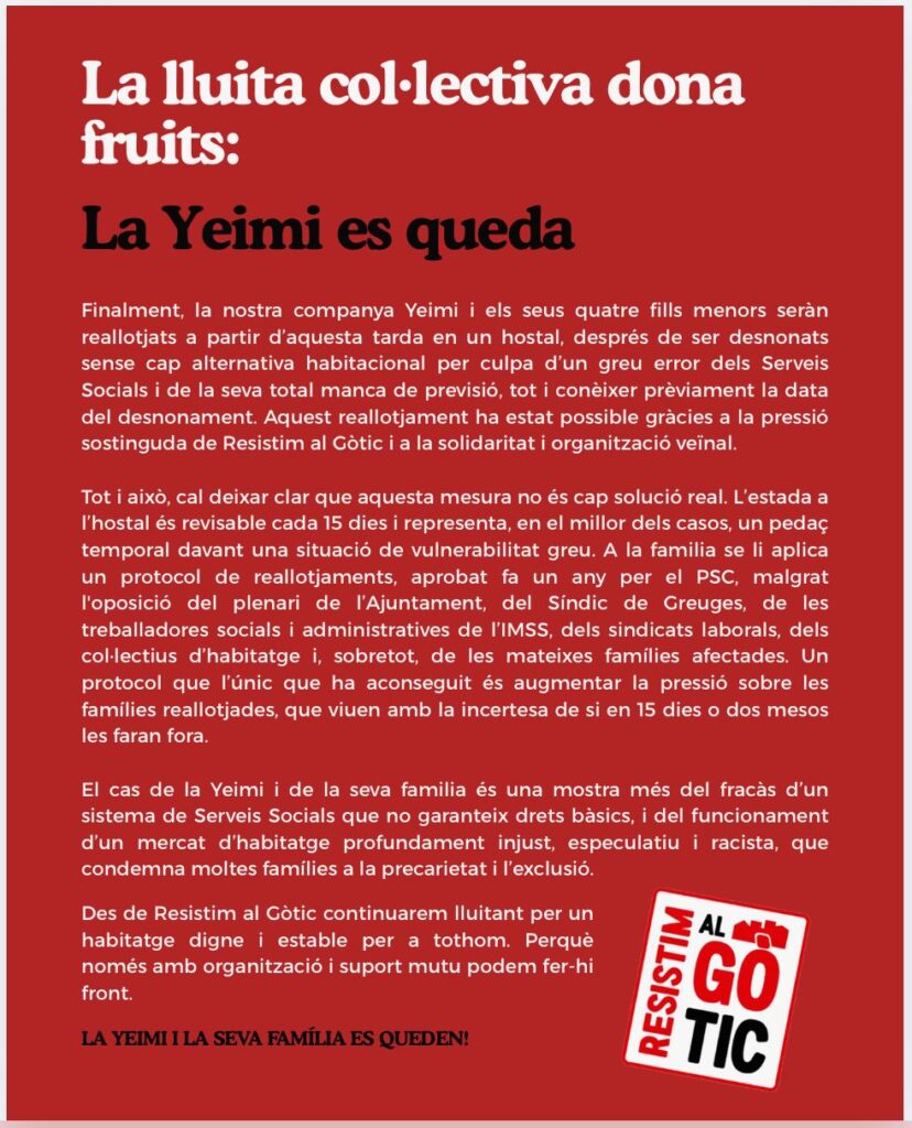 Us informem que, després del desnonament il·legal que van patir ahir l’Otman i la seva família i de la mobilització a Serveis Socials per aconseguir un reallotjament digne, avui ha accedit a un allotjament digne: un pis amb dues habitacions, cuina pròpia i bany. Considerem que, donada la tònica habitual per part de l’administració municipal, relegant a pensions o espais sense les mínimes condicions les persones desnonades de les seves cases, aquesta és una prova que no només la mobilització i la pressió funciona, sinó que l’acompliment del dret a l’habitatge i les responsabilitats de les administracions depenen fonamentalment de la voluntat de fer efectiu aquest dret.