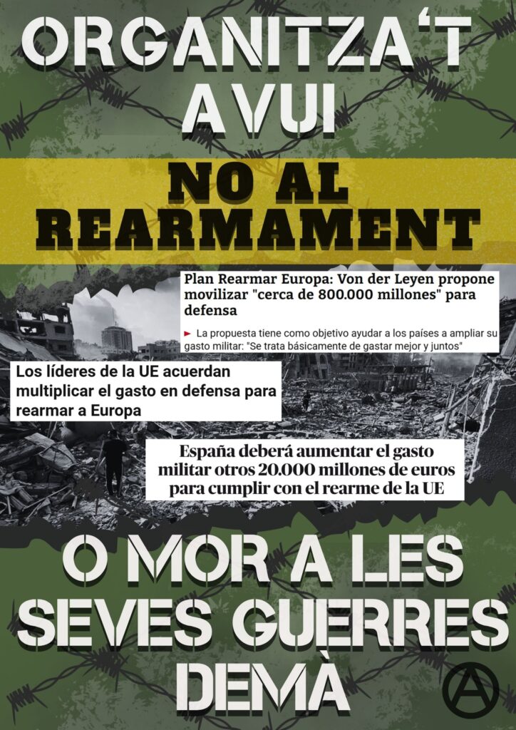 Per tot això, necessitem ser conscients del perill que suposa delegar les nostres vides a l’interès del capital. És hora de mobilitzar-nos i exercir la nostra agència política. Hem d’apel·lar a la desobediència, a la insubmissió, al sabotatge i a tota forma d’acció directa que tingui com a objectiu desarmar al capital a nivell internacional. Cap aparell estatal, nacional o estranger, defensarà els interessos de la classe desposseïda. És a través de l’autoorganització de la nostra classe a nivell internacional sense intermediaris ni representants electes que començarem a atacar de forma directa les estructures de dominació social a l’hora que prefigurem la societat igualitària en la què desitgem viure. Per a això és imperatiu organitzar-se des de la base avui mateix per evitar morir en les seves guerres demà. Encara estem a temps de desarmar al sistema en la seva totalitat, en tots els seus fronts i revertir la situació de dominació sota la qual vivim. Igual que ahir, avui tornarem a cridar: mort a l’estat i visca l’anarquia!
