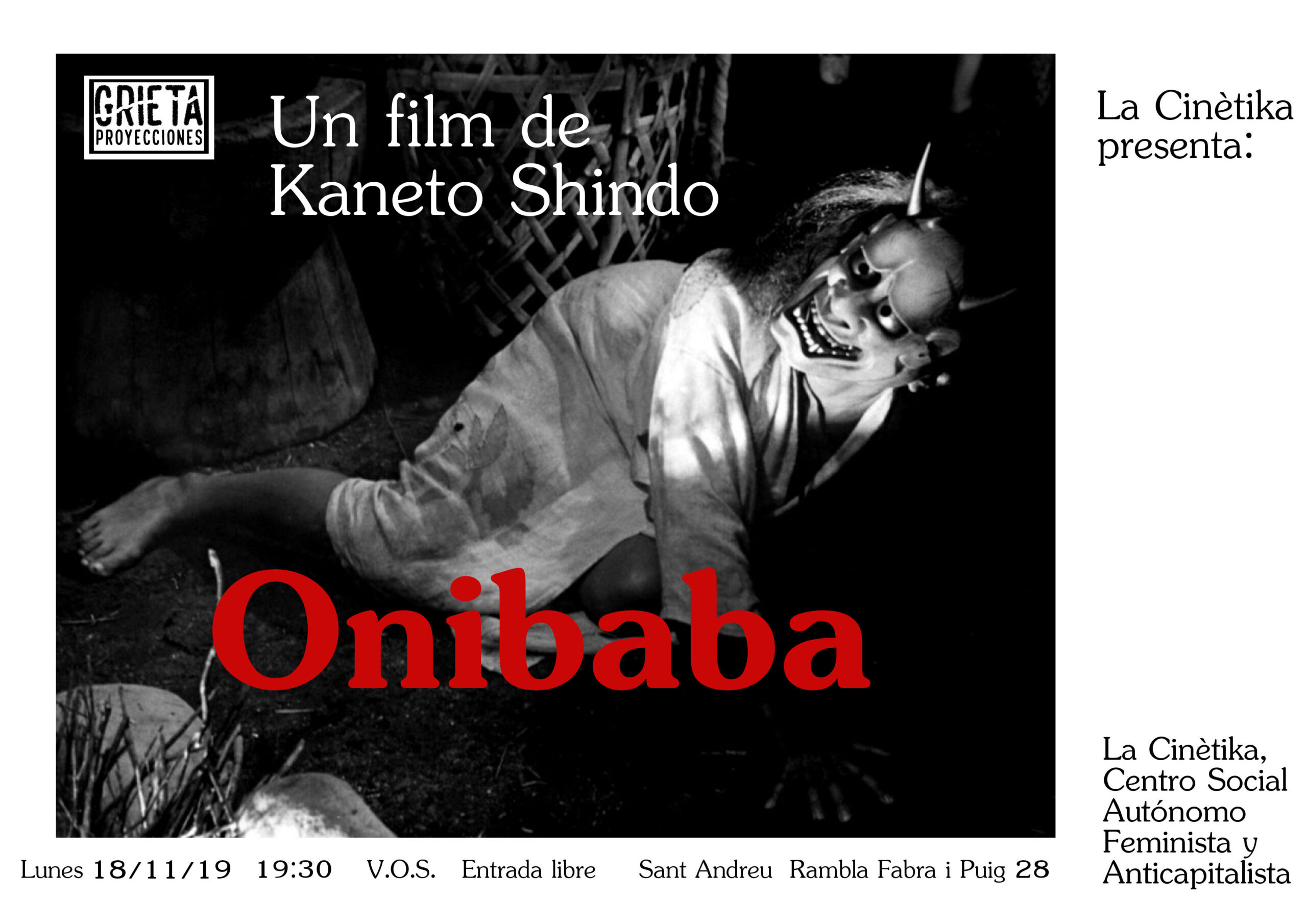 Proyecciones Grieta passarà “ONIBABA” de l’any 1964 i de 103 minuts de durada, dirigida i guionitzada per Kaneto Shindô. Al Japó feudal i en ple conflicte bèl·lic, dues dones sobreviuen assassinant a samuráis i venent les seves luxoses pertinences. La parella femenina està composta per una sogra (Nobuko Otowa) i la seva nora (Jitsuko Yoshimura), ambdues esperant el retorn del […]