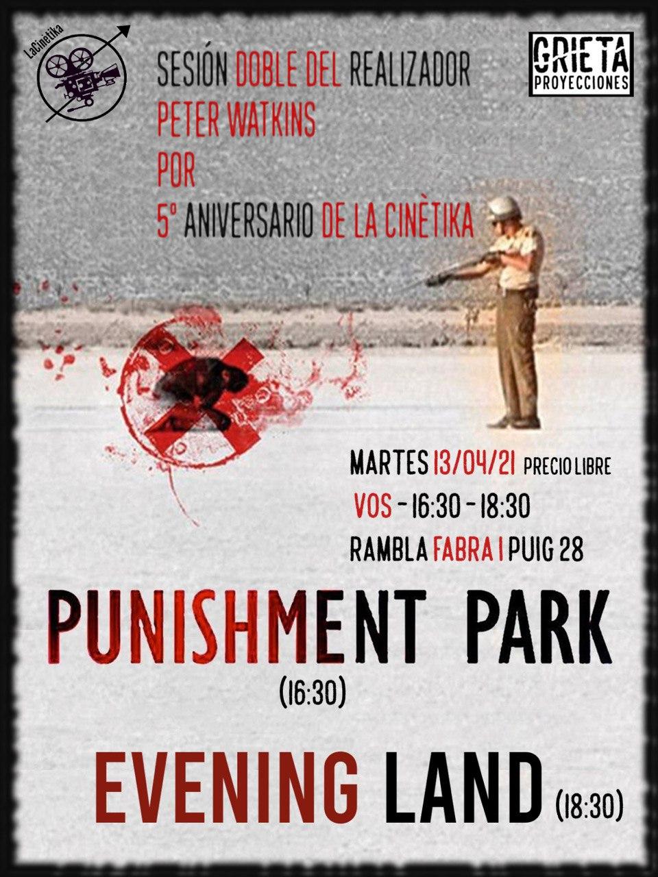 Sessió doble del realitzador Peter Watkins (13/04/21) per 5è Aniversari de la Cinètika El dimarts 13 d’abril a les 16:30h Proyecciones Grieta projectarà Punishment Park de 1971 i de 88 minuts de durada dirigida i guionitzada per Peter Watkins Estema al 1970. S’intensifica la Guerra de Vietnam. Hi ha massives […]