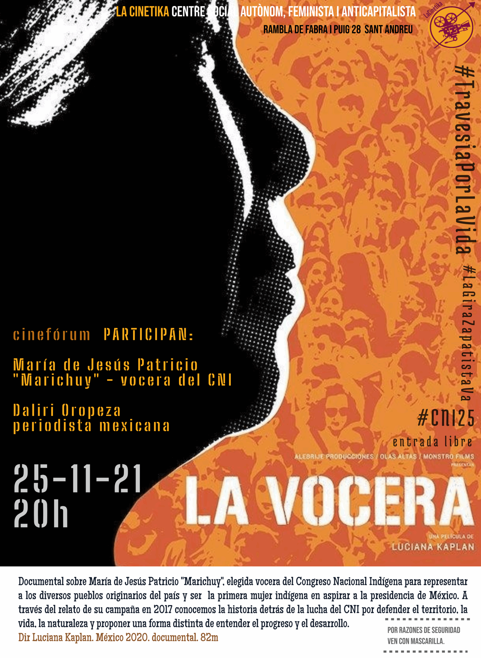 Luciana Kaplan | México | 2020 | Castellano- Maya – Yaqui – Wixárika | documental | 82 mins. El 25 de noviembre tendremos el pase del documental La Vocera y contaremos con la participación de Marichuy, Vocera del CNI ( Congreso Nacional Indígena), que se encuentra en Barcelona en el marco de la Gira Por la Vida zapatista. […]