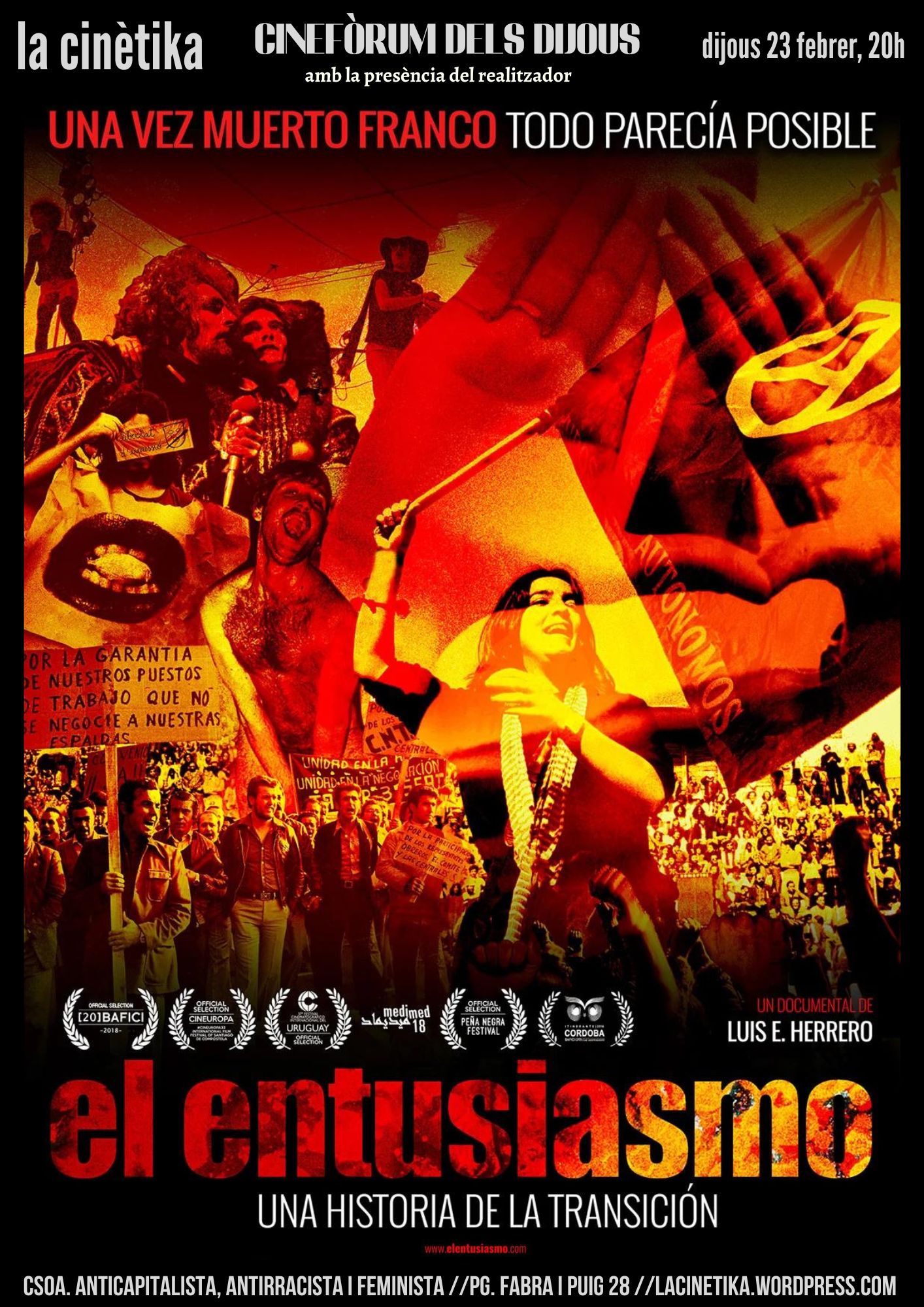 Luis Herrero, El entusiasmo, España. 2018. Documental, 1h20m Con la muerte de Franco un estado de ánimo se apoderó de la sociedad española. Luchas obreras, vecinales, legalización de partidos y sindicatos, feminismo, contracultura… libertades colectivas e individuales que encontraron especial intensidad en el ámbito libertario y la CNT. En una […]