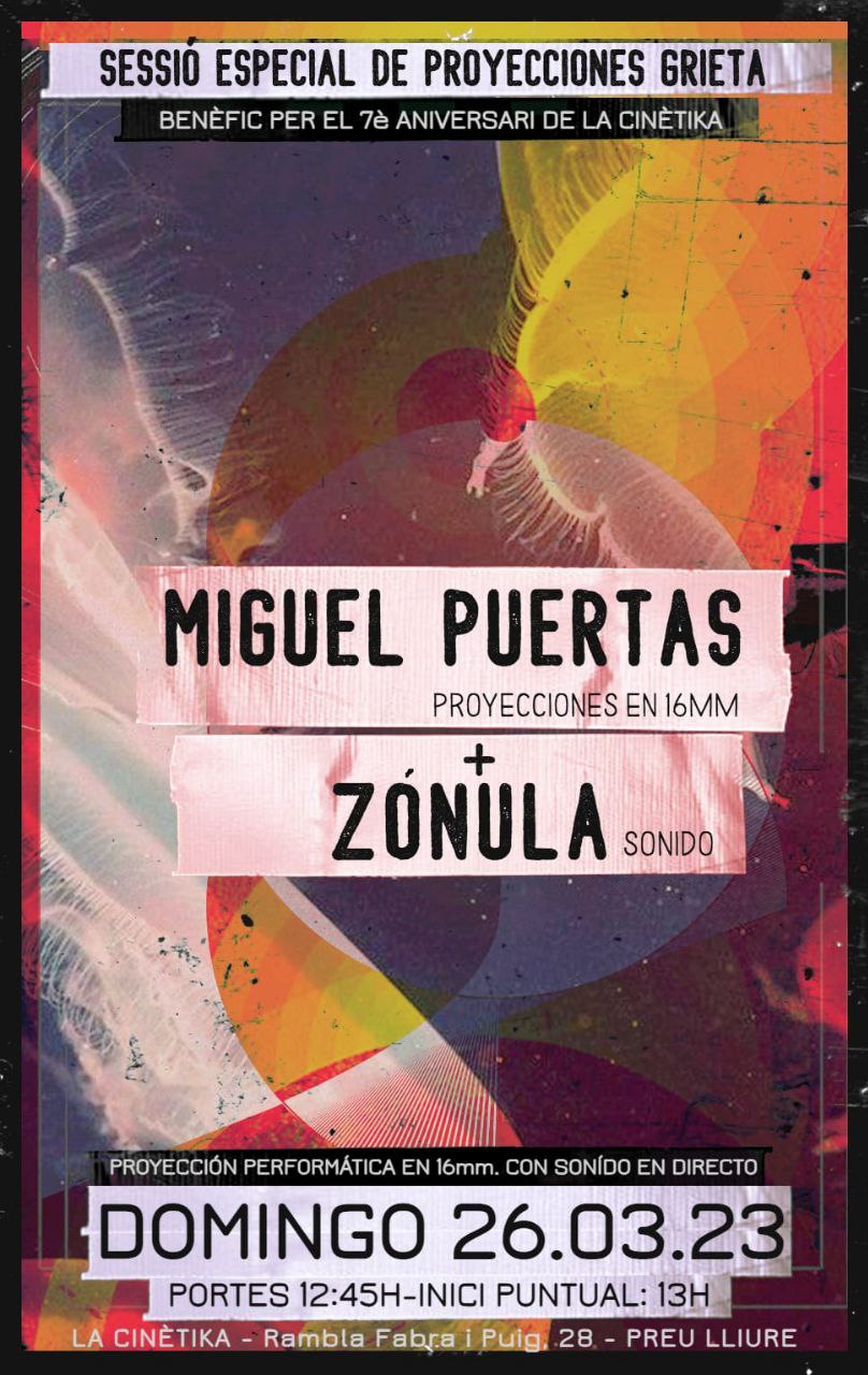 Serà el diumenge 26 de març com sempre a la Sala 10. Projecció performàtica en 16 mm amb so en directe:– Miguel Portes projeccions en 16 mm– Zònula so. Obrim portes a les 12:45h.Inici puntual a les 13h. Preu lliure benèfic per al 7è Aniversari de La Cinètika