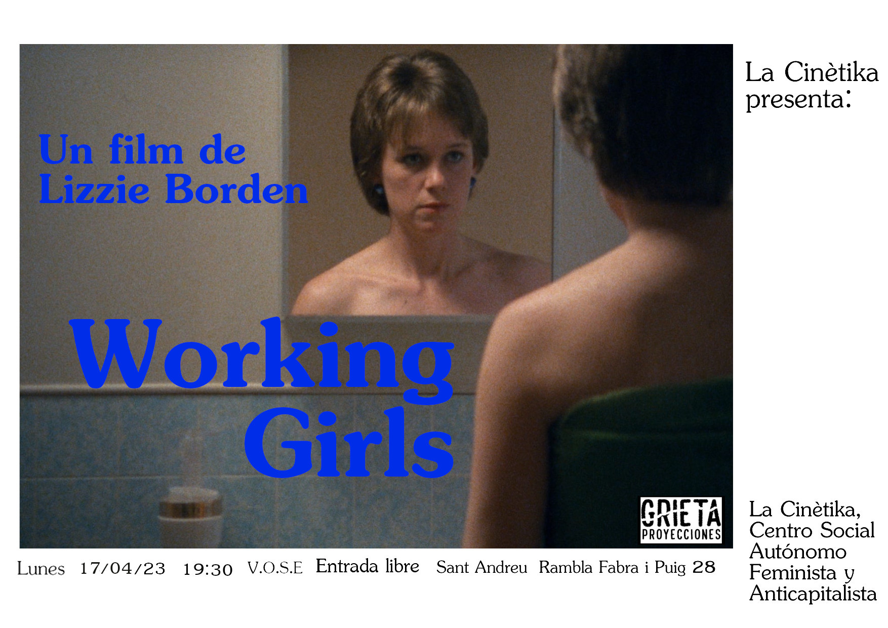 El dilluns 17 d’abril a les 19:30h Proyecciones Grieta projectarà Working Girls de 1986 de 93 minuts de durada i dirigida per Lizzie Borden. La pel·lícula és un retrat cru de les dones prostitutes, els clients masculins i les motivacions d’ambdós.