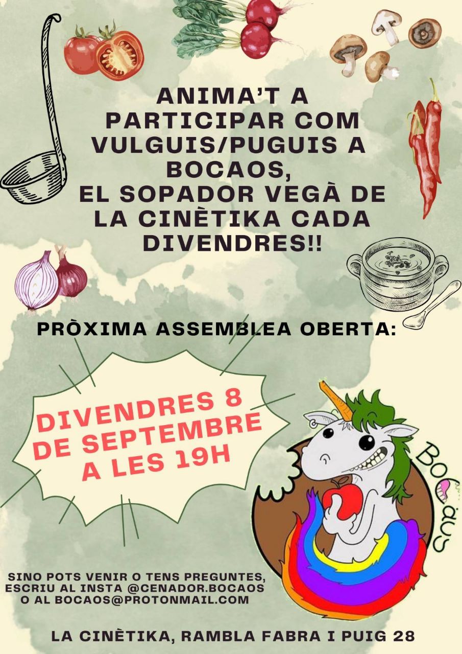 Saps què és el projecte Bocaos? És el sopador vegà de la Cinètika, en el que un grup de persones fem el sopar cada divendres. Som poquetes i estem buscant gent nova amb ganes de participar. Avui divendres 8 de setembre a les 19h farem assemblea oberta! Vine i participa-hi!