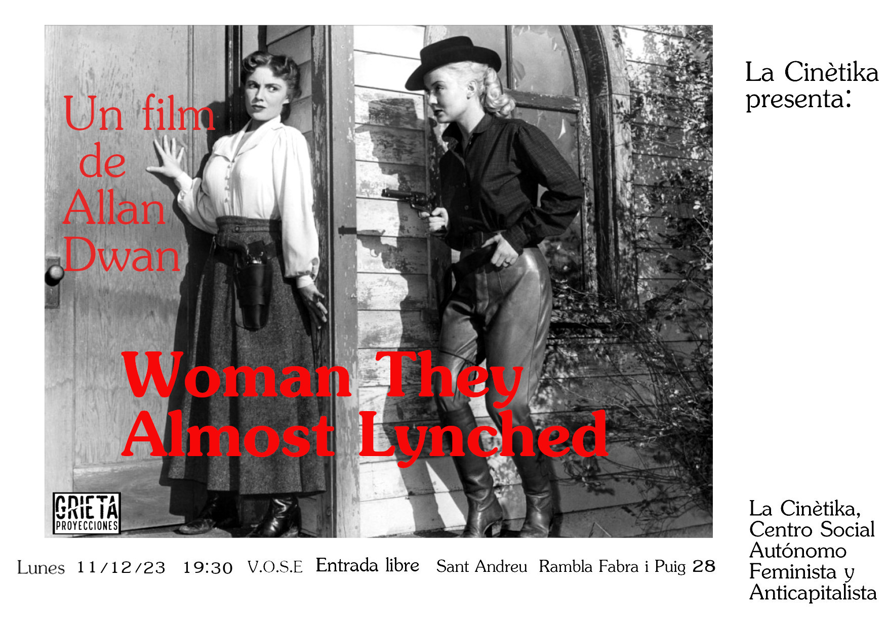 El dilluns 11 de desembre a les 19:30h Proyecciones Grieta projectarà Woman They Almost Lynched de 1953 de 91 minuts de durada i dirigida per Allan Dwan. Durant la Guerra de Secessió, Border City és un poble miner situat entre la zona unionista i la confederada, i està dirigit amb […]