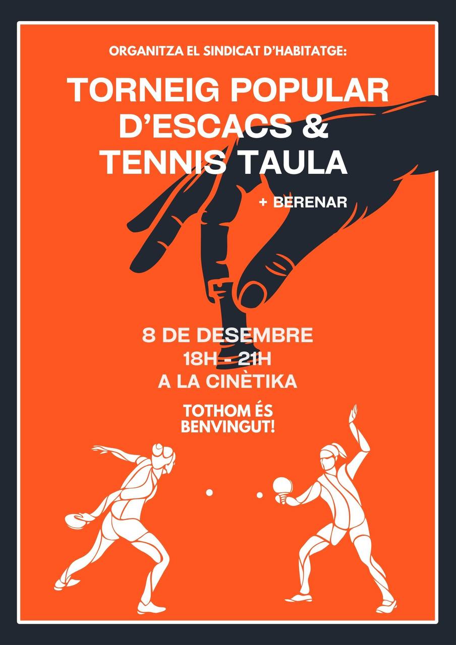 El divendres 8 de novembre, de 18h a 21h el Sindicat d’Habitatge de Sant Andreu organitza un torneig popular d’escacs & ping-pong i un berenar popular. Hi haurà merxandatge del Sindicat per la seva pròpia autogestió.
