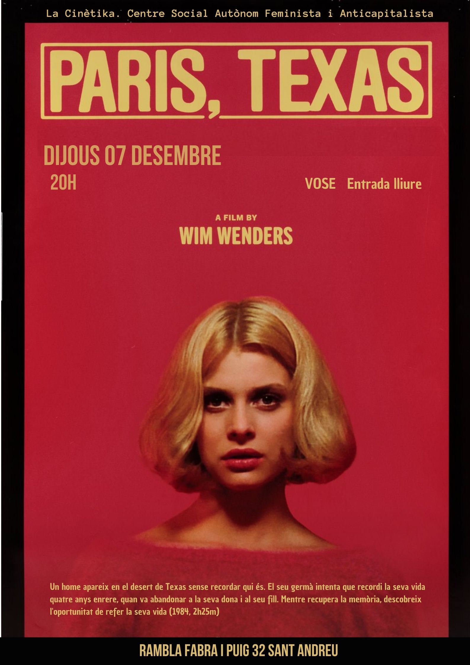 Paris, Texas. Wim Wenders. França, Almenya. Drama. 1984. 2 h 25m. VOSE Un home apareix en el desert de Texas sense recordar qui és. El seu germà intenta que recordi la seva vida quatre anys enrere, quan va abandonar a la seva dona i al seu fill. Pel·lícula de culte […]