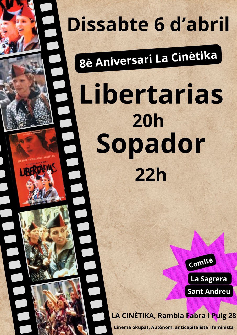 El dissabte 6 d’abril a les 20h en el marc del 8’e aniversari de La Cinètika, el Comitè 8M Sagrera i Sant Andreu projectarà Libertarias, de 124 min, VO, dirigida per Vicente Aranda (1996). Posteriorment hi haurà sopador vegà a les 22h. Vine amb nosaltres a celebrar l’aniversari de l’espai!! […]