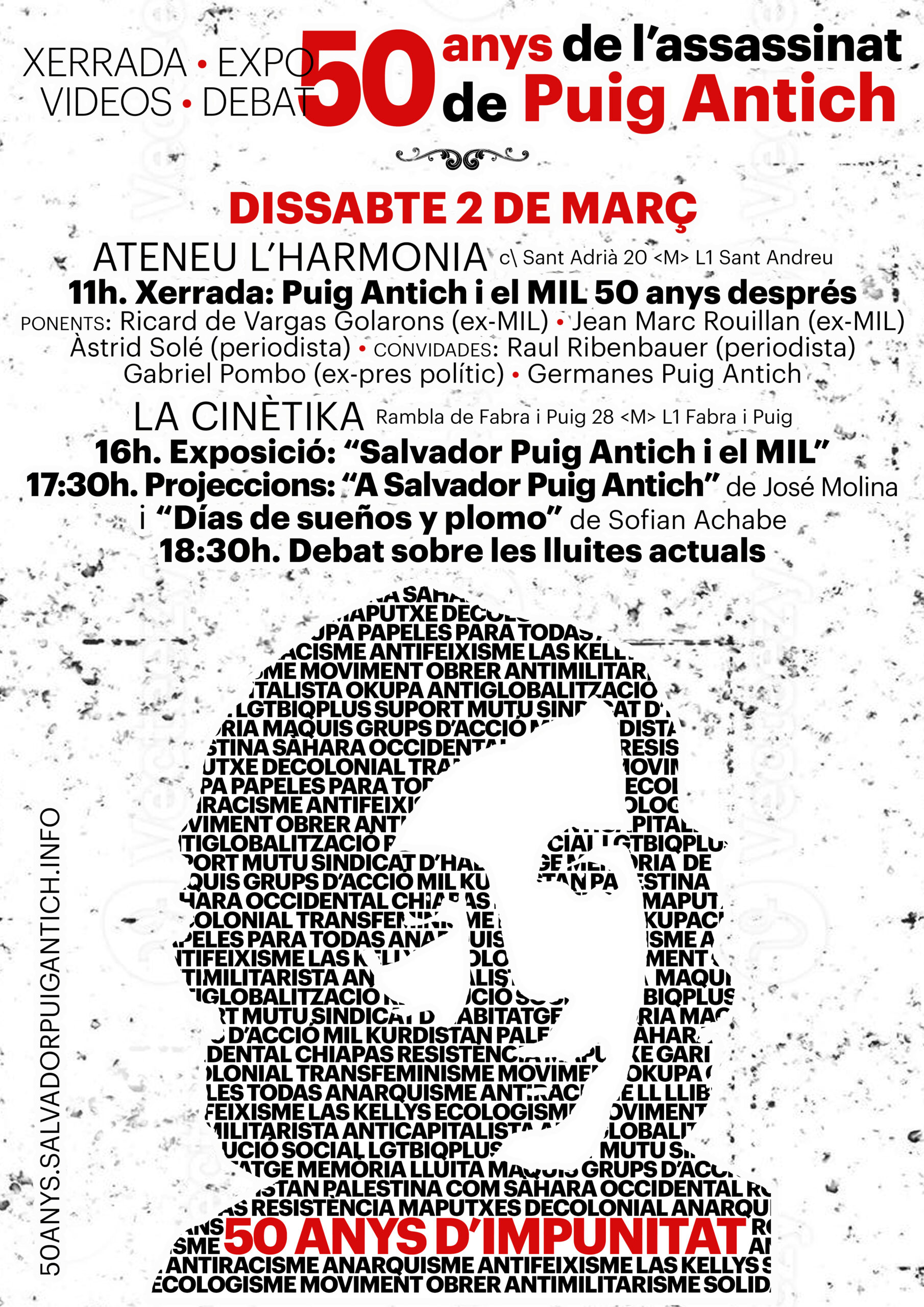 El 2 de març farà 50 anys que la dictadura franquista va executar a Salvador Puig Antich a garrot vil. El militant llibertari del MIL va ser, junt amb Heinz Chez, la darrera persona executada per aquest cruel mètode. Per recordar la seva persona i la seva lluita contra la […]