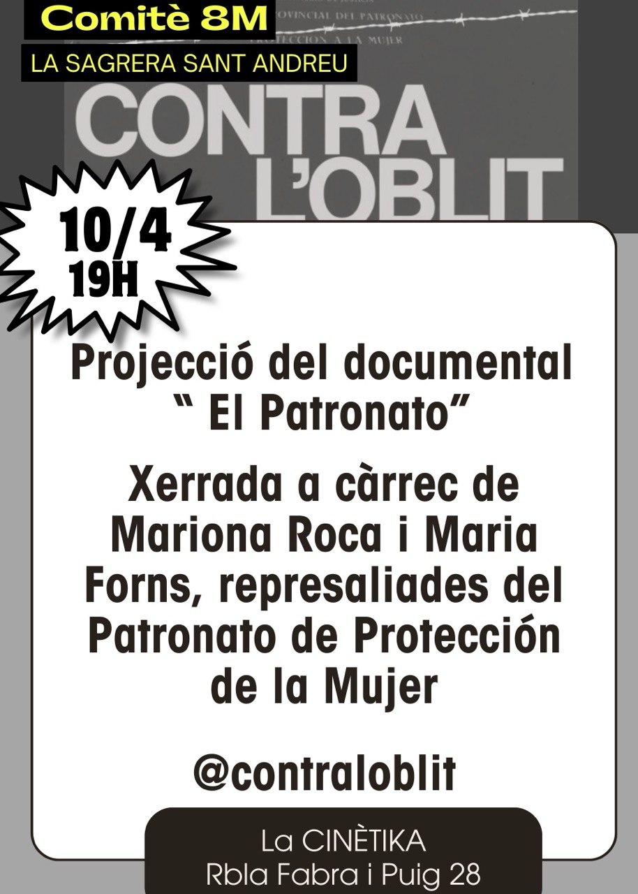 El dimecres 10 d’abril a les 19h el Comitè 8M Sagrera i Sant Andreu projectarà el documental El Patronato, de 42 minuts, VO, dirigida per Teresa Martín i Rosa Alcántara (2018).Després hi haurà una xerrada amb dues testimonis que van viure els fets. SinopsiEl Patronat de Protección a la Mujer, […]
