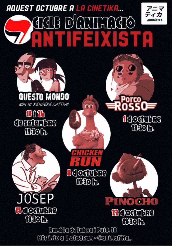 El dimarts 17 de setembre Animàtika iniciarà el Cicle d’ Animació Antifexista de projeccions que durarà fins al final d’octubre. Combinarà anime, animació occidental, stop motion i molt de vermell, negre i 0 feixisme. Les sessions són:17/09- Este mundo no me hará mala persona pt 124/09- Este mundo no me […]