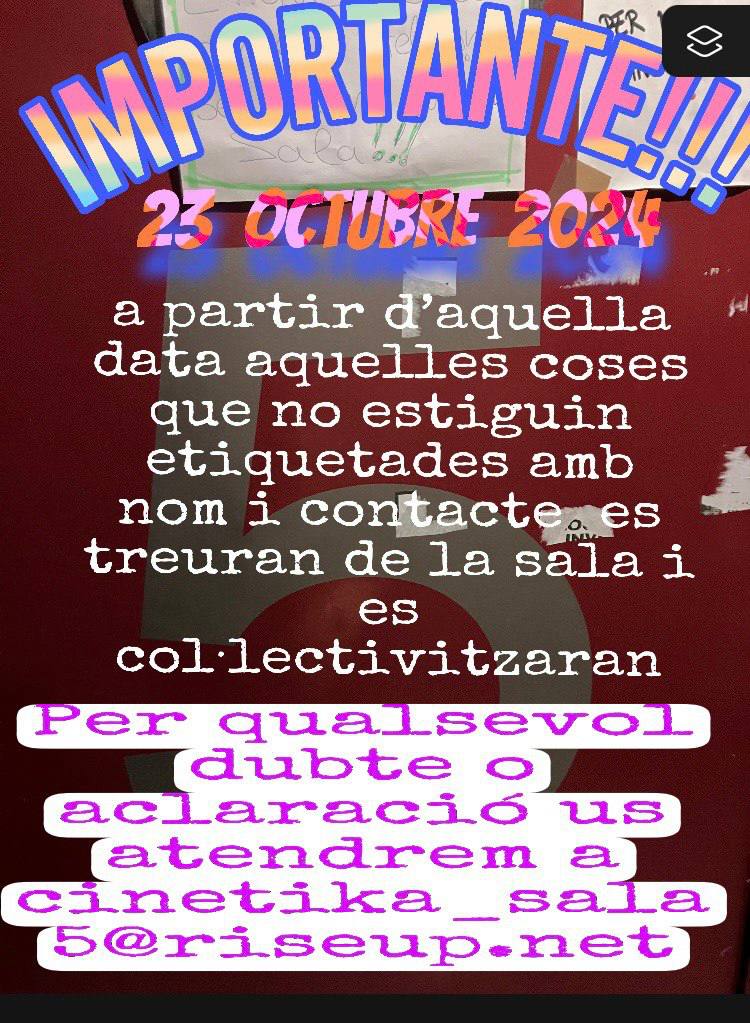 Si sabeu de gent que tingui coses a Sala 5 passeu-li el missatge. Encara hi ha moltes coses sense etiquetar o que nomes tenen el nom. A partir del dia 23 d’octubre, tot allò que no tingui nom i alguna manera de contactar es col.lectivitzarà. Totes aquelles persones que heu […]