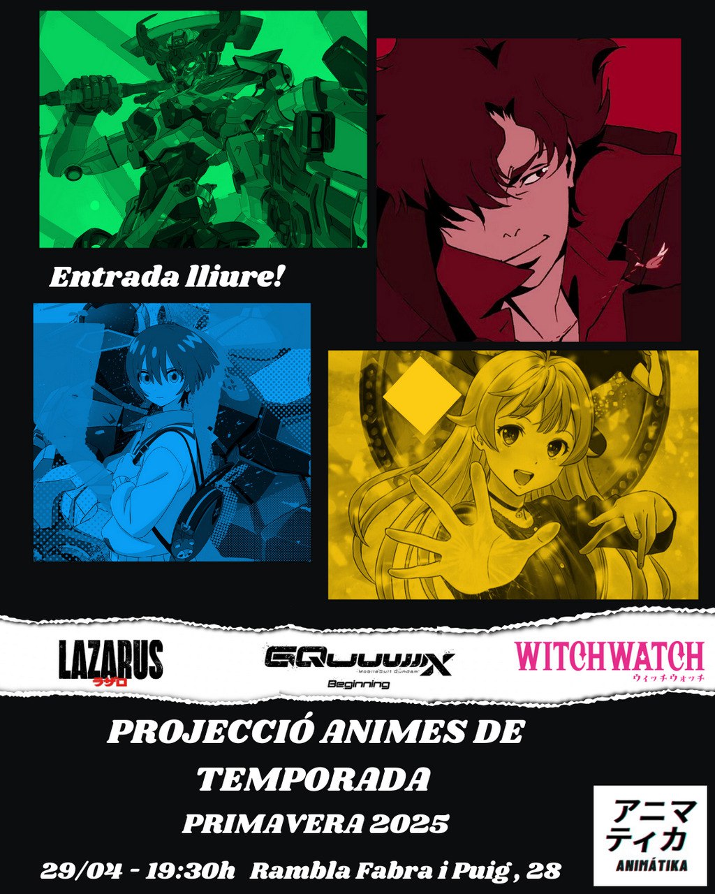 Avui dimarts 29 d’abril a les 19.30h, Animàtika projectarà animes de temporada de primavera, VOSE (2025).Abans de començar maig (amb alguna sorpesa, estigeu atentis!), projectarem animes de temporada de primavera. Gundam GquuuuuuxWitchWatchLazarus Gundam de la mà de Hideaki Ano amb una altra protagonista pelroja. Una adolescent que s’implica en batalles […]
