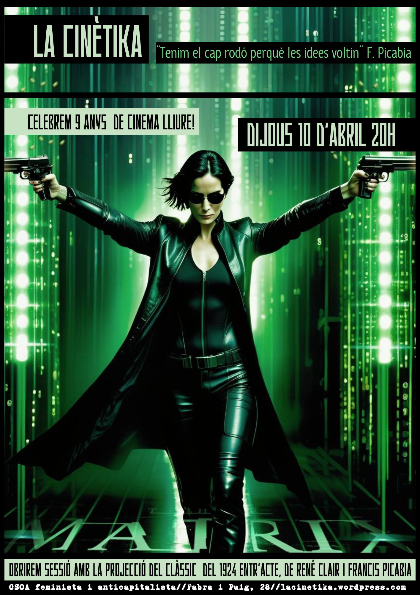 Comencem els festejos d’aniversari. Cinema dijous, igual que la Cinètika, celebra 9 anys projectant gairebé cada dijous! Volem celebrar el dijous 10 d’abril a les 20h amb un poema visual: Entr’ecte, dirigida per René Clair i Francis Picabia, de 25 minuts de durada (1924) i amb Matrix, la pel·lícula que […]