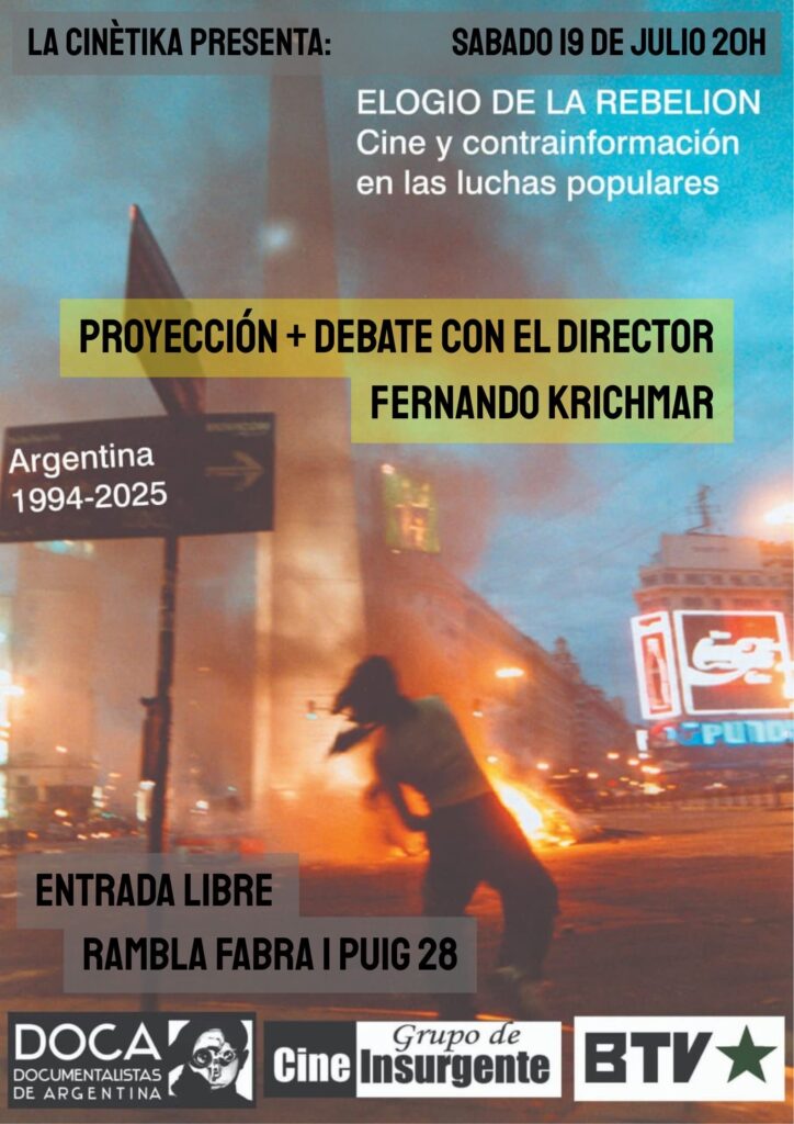 Avui dissabte 19 de juliol a les 20h, projectarem Elogi de la Rebelió, cinema i contrainformació en les lluites populars. Un llarmetratge documental sobre la cobertura audiovisual alternativa en la rebelión del 19 y 20 de diciembre de 2001 a l’Argentina, dirigida per, de Fernando Krichmar, de 94 minuts de durada (2021).