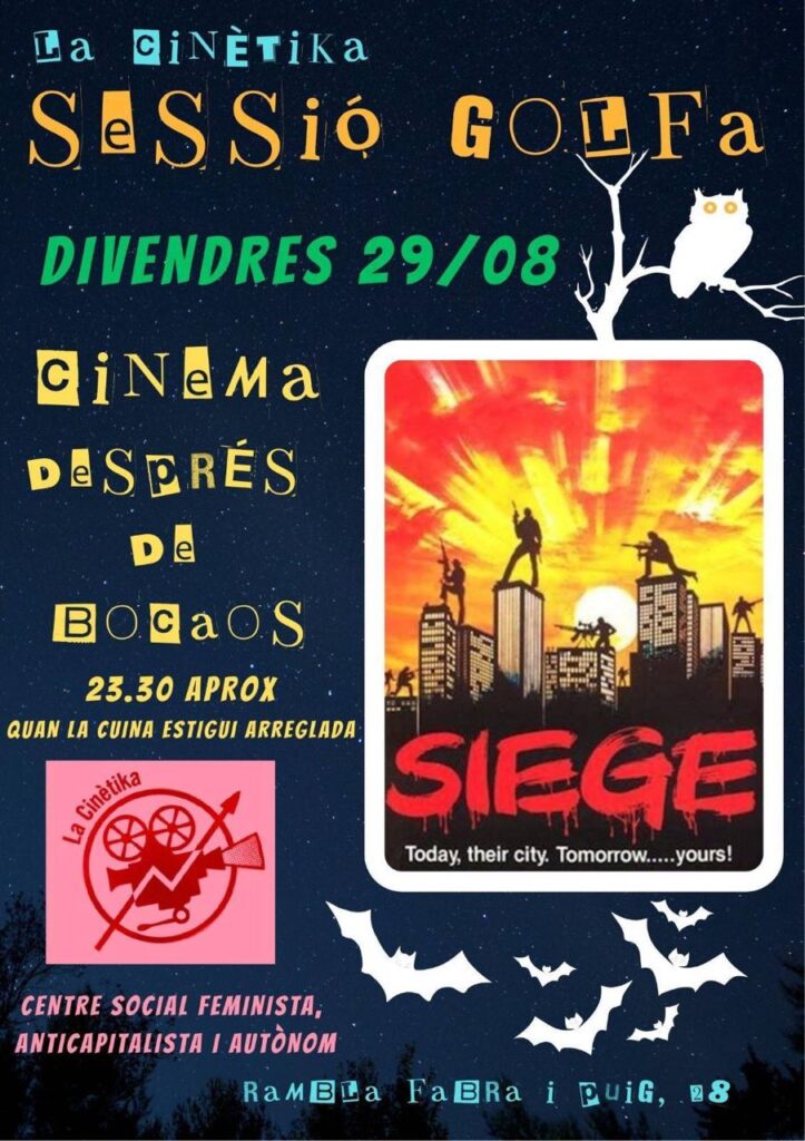 Avui divendres 29 d’agost a les 23.30h aproximadament, projectarem Venganza sin ley (Siege), dirigida per Paul Donovan i Maura O’Connell, de 93 minuts de durada, VOSE (1983).