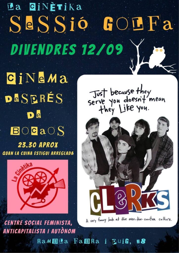 Avui divendres 12 de setembre a les 23.30h aproximadament, projectarem Clerks, dirigida per Kevin Smith, de 99 minuts de durada (versió extensa), VOSE (1994).