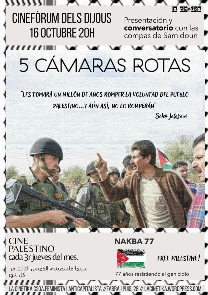 Com cada 3r dijous de mes, a cinema dijous fem Cinema palestí. Aquest dijous 16 de octubre a les 20h projectem 5 cámaras rotas ( 5 broken cameres), documental dirigit pel cineasta palestí Emad Burnat i el israelí Gy Davidi en 2011, de 1h 36 min de durada. Documental guardonat per Sundance.