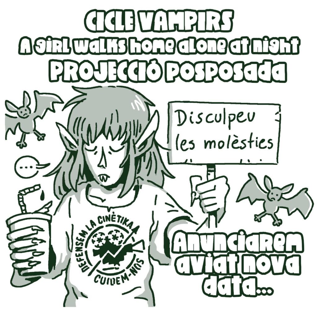 Per motius relacionats amb el funcionament i l’administració de la Cinètika com a espai autogestionat, aquest diumenge 26 d’octubre s’anul·la la projecció de A girl walks home alone at night, corresponent al Cicle de Vampirs.