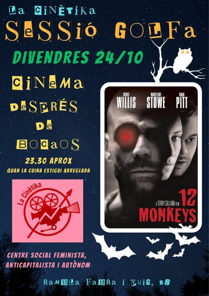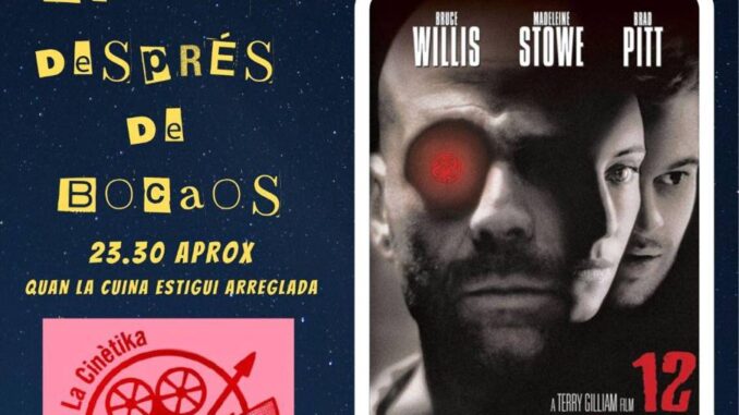Avui divendres 24 d’octubre a les 23.30h aproximadament projectarem 12 Monkeys (12 Monos), dirigida per Terry Gilliam, de 129 minuts de durada, VOSE (1995).