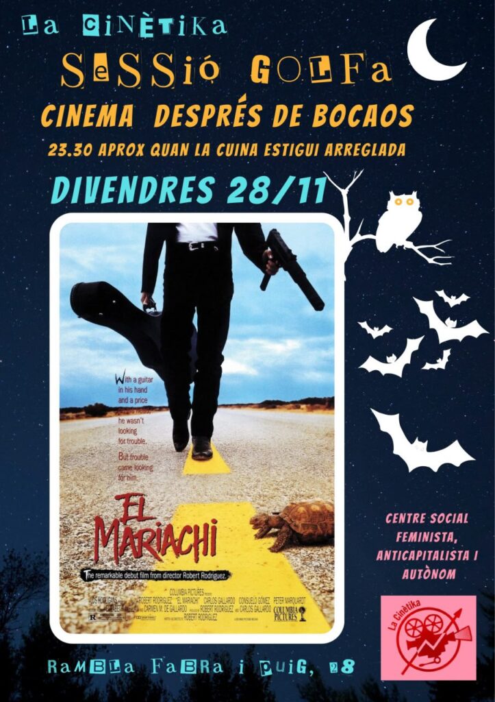 Avui divendres 28 de novembre a les 23.30h aproximadament, projectarem El Mariachi, dirigida per Robert Rodríguez, de 81 minuts de durada, Versió original en mexicà (1992).