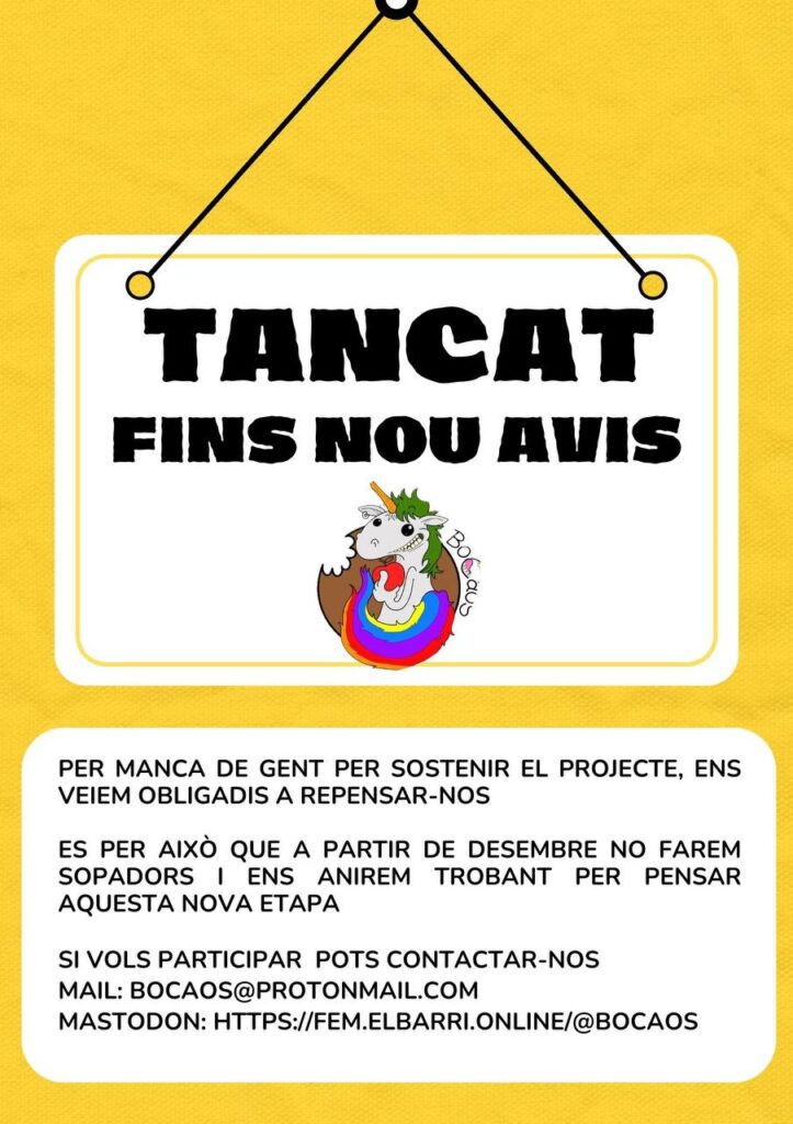 Algunes de les persones que movem Bocaos vam coincidir en que no funciona com a projecte. Hem deixat de ser un col·lectiu. No ens trobem per parlar de cuina i propostes de plats, ni tan sols de què esperem del projecte i què ens agradaria fer-hi. Cada setmana s’omplen un rols de cuina des de la distància, i sembla que complir individualment amb el plat que s’anota sigui tot el que s’espera. D’aquests rols, gairebé mai es reparteixen els menys glamurosos de comprar o recollir, i feines logístiques com rentar draps o comprar material cauen a les mateixes poques persones que fan cap a les assemblees.