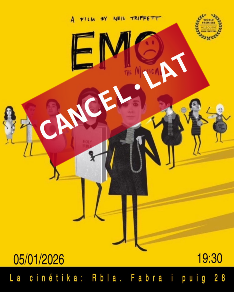 ATENCIÓ: Es cancel·la la projecció d’Emo the musical, Dir. Neil Triffett (2014) 5 de gener de 2026 cinetika PROJECTES 0 Es cancel·la la projecció! Tornem la setmana que ve!