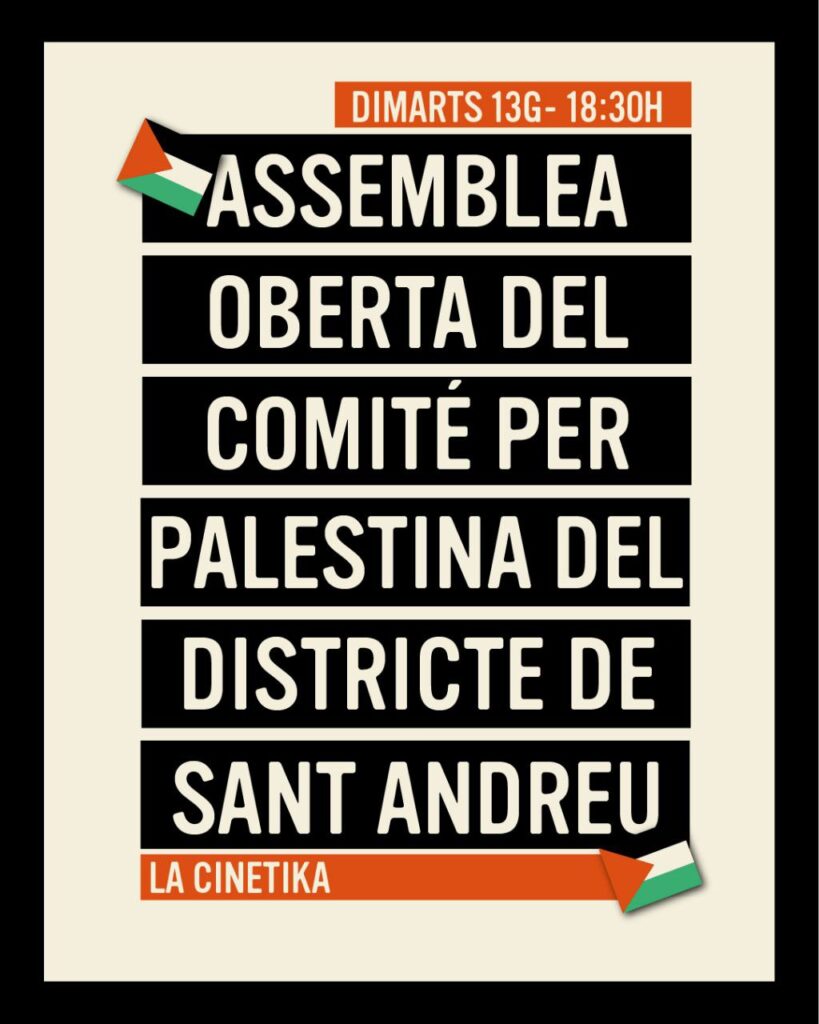 El Comitè de suport a Palestina del districte de Sant Andreu si trobarà avui dimarts 13 de gener a les 18:30h, fent una assemblea oberta a La Cinètika.