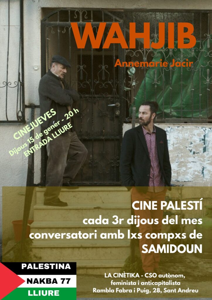 El dijous 15 de gener a les 20h, com cada tercer dijous de mes, Cinema dijous projectem cinema palestí. En aquesta ocasió, Wajib “Invitació de noces” de 1h33m. És la tercera pel·lícula de la cineasta palestina Annemarie Jacir, que en 2008 es va convertir en la primera dona al seu país a dirigir un llargmetratge amb “La sal d’aquesta mar”.