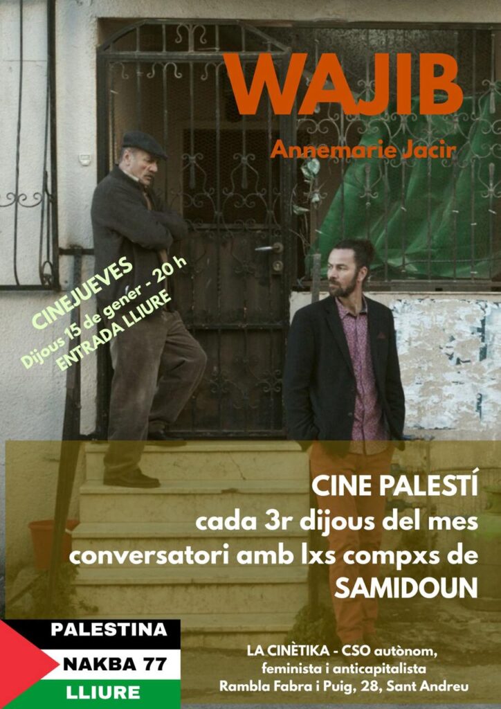 Avui dijous 15 de gener a les 20h, com cada tercer dijous de mes, a Cinema dijous projectem cinema palestí. En aquesta ocasió, Wajib “Invitació de noces” de 1h33m. És la tercera pel·lícula de la cineasta palestina Annemarie Jacir, que en 2008 es va convertir en la primera dona al seu país a dirigir un llargmetratge amb “La sal d’aquesta mar”.