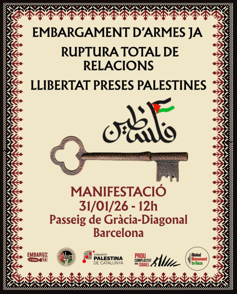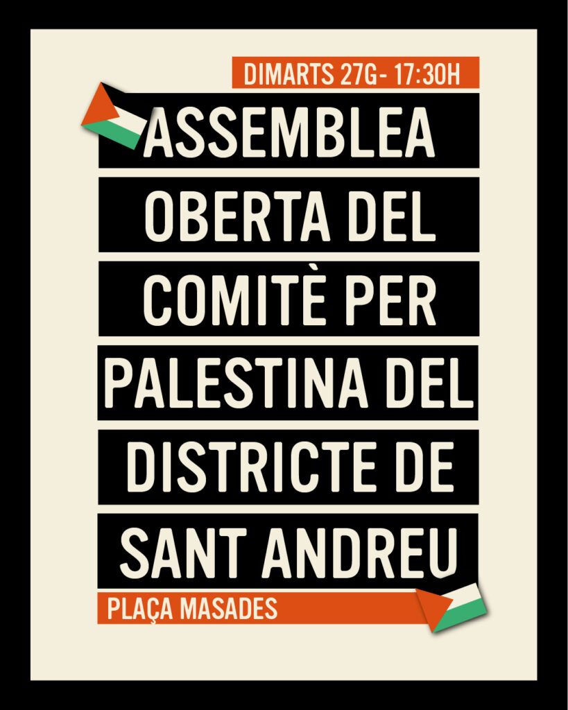 27/01/26 Assemblea Oberta del Comitè per Palestina de Sant Andreu 🗓 20 de gener de 2026 cinetika COL·LECTIUS, La Cinètika rules 0 Serà el proper dimarts 27 de gener a les 17:30h a la Pl. Masadas. Entre d’altres coses parlarem de com anirem a la manifestació per Palestina convocada pel proper 31 de gener a Barcelona. 27 de gener de 2026 from 17:30 to 20:00 Scheduled ical Google outlook COL·LECTIUS La Cinètika rules