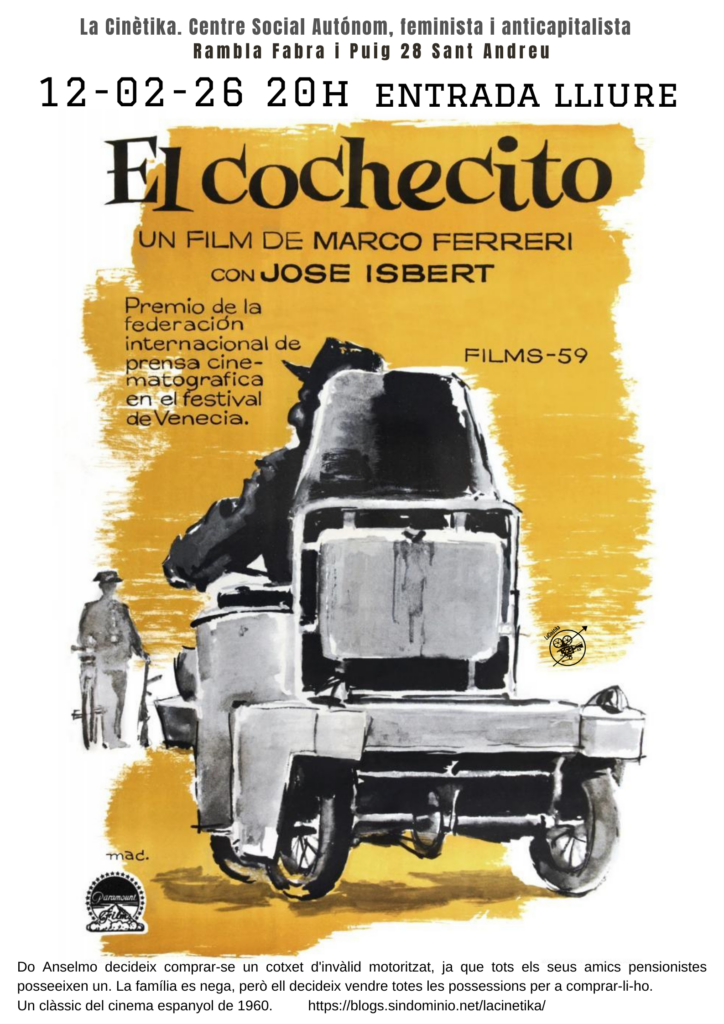 El dijous 12 de febrer a les 20h, a Cinema dijous projectarem El cochecito, de Marco Ferreri. Guanyadora del Premi de la Crítica en el Festival de Venècia l’any 1960 i d’1 hora i 26 minuts de durada. Versió original en castellà.