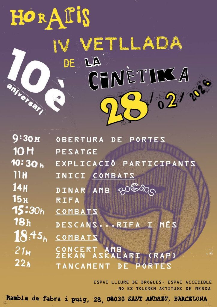 28/02/26 Horaris de la 4a Vetllada d’esports de contacte de La Cinètika 🗓 24 de febrer de 2026 cinetika PROJECTES 0 Serà aquest dissabte 28 de febrer a partir de les 9:30h. 28 de febrer de 2026 from 09:30 to 22:00 Scheduled ical Google outlook PROJECTES