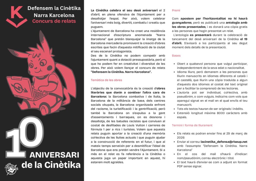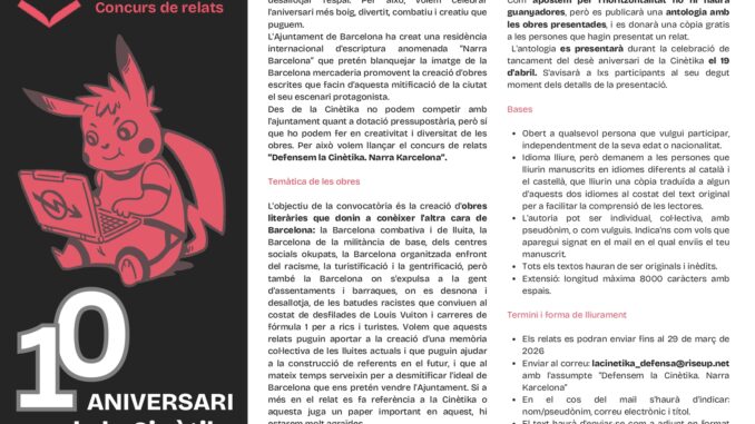 Comencem a calentar motors pel 10è aniversari de la Cinètika amb la convocatòria d’aquest concurs de relats per disputar el discurs de l’ajuntament de la Barcelona mercaderia.