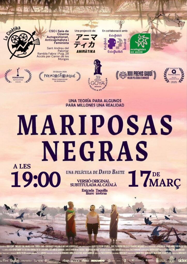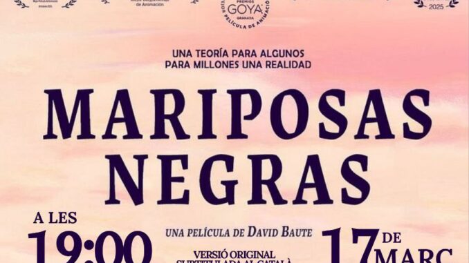El dimarts 17 de març a les 19h, Animàtika projectarà Papallones negres, dirigida per David Baute, de 78 minuts de durada, Estat espanyol, Doblada al català (2024).