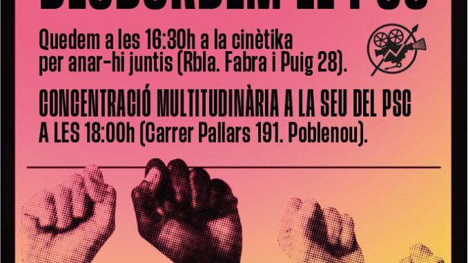Convoquem també la Concentració unitària contra el PSC i les seves polítiques capitalistes, aparofòbiques i antiobreres. Vine avui dijous 19 de març a les 18h a la seu del PSC, al carrer de Pallars 191 a Barcelona. Quedem a les 16:30h a La Cinètika per anar-hi totis juntis.