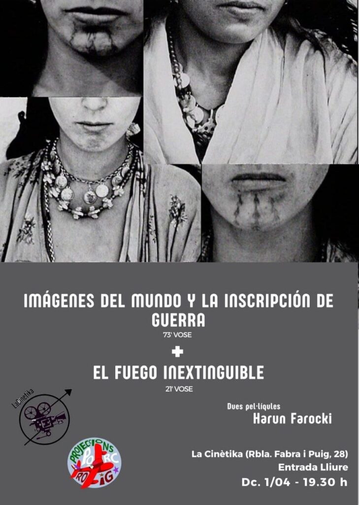 El dimecres 1 d’abril a les 19:30h, Projeccions Porc Roig projectarà El Fuego Inextinguible (de 21 minuts de durada) + Imágenes del Mundo y la Inscripción de Guerra (de 73 minuts de durada), dirigides per Harun Farocki, VOSE (1969+ 1989).