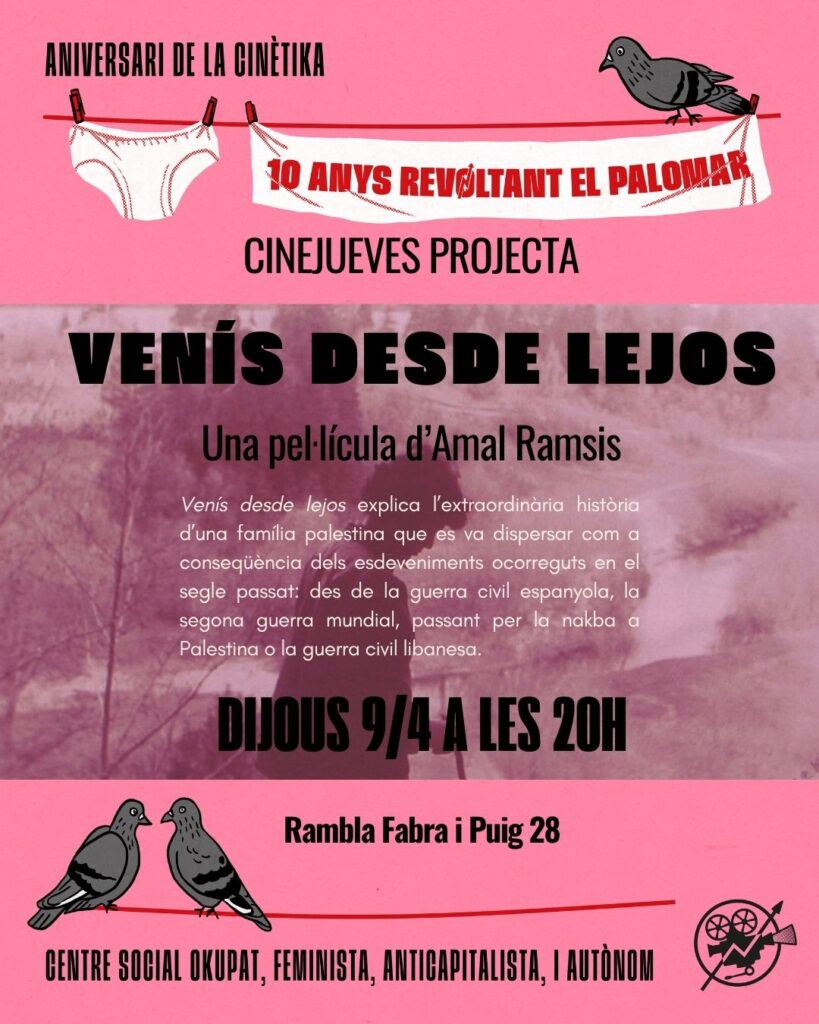 El dijous 9 d’abril a les 20h, Cinema dijous – Cinema palestí projectarà Venís desde lejos, dirigida per Amal Ramsis, de 85 minuts de durada, VOSE (2018).