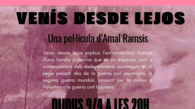 El dijous 9 d’abril a les 20h, Cinema dijous – Cinema palestí projectarà Venís desde lejos, dirigida per Amal Ramsis, de 85 minuts de durada, VOSE (2018).