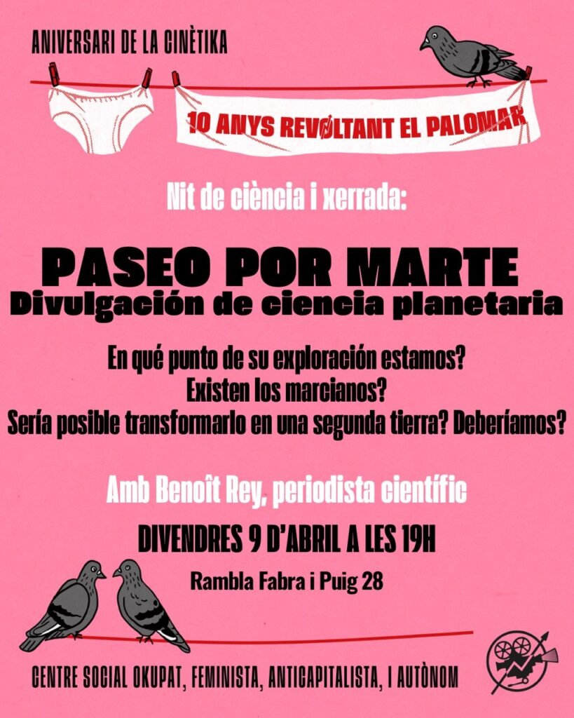 El dijous 9 d’abril a les 19h farem una xerrada divulgativa de ciència planetària: Una passejada per Mart amb Benoît Rey, periodista científic.