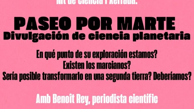 El dijous 9 d’abril a les 19h farem una xerrada divulgativa de ciència planetària: Una passejada per Mart amb Benoît Rey, periodista científic.