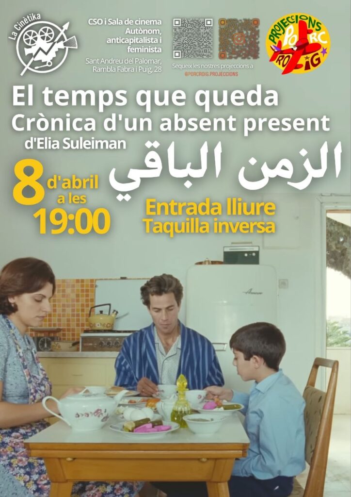 Avui dimecres 8 d’abril a les 19h, Porc Roig projectarà una comèdia sobre l’ocupació de Palestina titulada El temps que queda, crònica d’un absent present, dirigida per Elia Suleiman, de 109 minuts de durada, VOSE (2009).